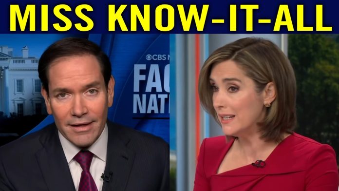 news1todaysnewsW1winner CBS Host CALLED OUT after LYING to Secretary Marco Rubio By Americas Trusted News - October 9, 2025 0 19 FacebookTwitterPinterestWhatsApp IMAGE ABOVE FROM VIDEO BELOW TOP COMMENTS FROM VIDEO BELOW THIS LADY NEEDS A SOMBRERO AND A MUSTACHE The trump admin is at least trying its best to make peace without putting boots on the ground…… I have to admire that.